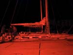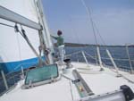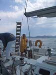 Wir holen schon etwas früher als normalerweise nötig die Segel ein - unser Rückwärtsgang ist ja noch immer defekt und wir können somit aus eigener Kraft nicht in der Marina anlegen. Wir leinen uns an der 'Moonwalker' an und Herbert bugsiert unser Boot mit einem zentimetergenauen Manöver an den Liegeplatz.